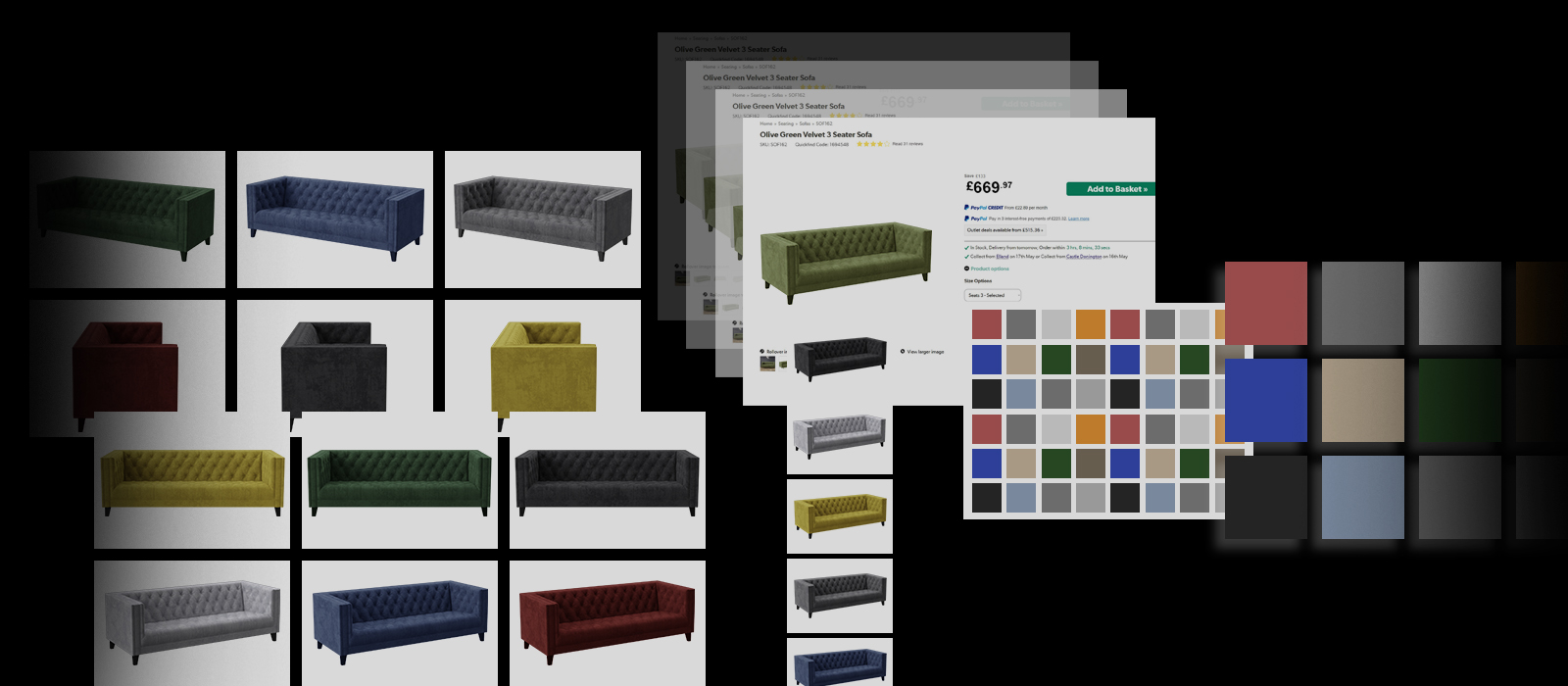 Create millions of high-quality CG Images for every product, range and style. Get to market fast and easy with cut outs, silos, 360 spins or lifestyle shots for every channel: online, print and more.